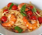 Pâtes aux crevettes, tomates et basilic