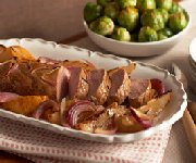 - PLACER la viande dans un moule de 13 x 9 po vaporisé d'un enduit à cuisson. Disposer les tranches de poires, les quartiers d'oignon et l'ail autour de la viande.