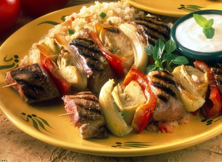 - Enfiler les cubes d'agneau, en alternant avec des demi-artichauts et des morceaux d'oignon et de poivron, sur de petites brochettes de bambou ou sur de grandes brochettes de métal. Si vous utilisez des brochettes de bambou, elles doivent tremper 1 heure dans l'eau pour éviter qu'elles ne brûlent.
