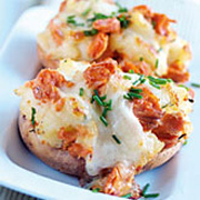 - Couper les pommes de terre en deux, les vider et déposer la chair dans un bol, laissant les pelures intactes. Faire une purée de la chair et incorporer le beurre. Morceler le mozzarella et l'ajouter à la purée de pommes de terre avec la ciboulette, le saumon et la plus grande partie du cheddar. Saler et poivrer et bien mélanger.