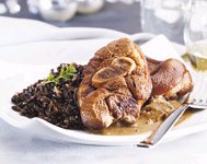 - Sortir la casserole du four et retirer les jarrets de la sauce, les réserver dans une grande assiette (enlever la peau et le gras et les déssosser si désiré) et les couvrir d'une feuille de papier aluminium. Mettre la casserole sur la cuisinière à feu moyen et porter le liquide à ébullition, puis réduire jusqu'à l'obtention de la saveur désirée.
